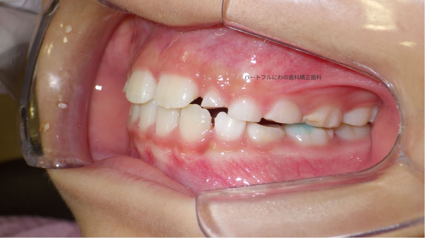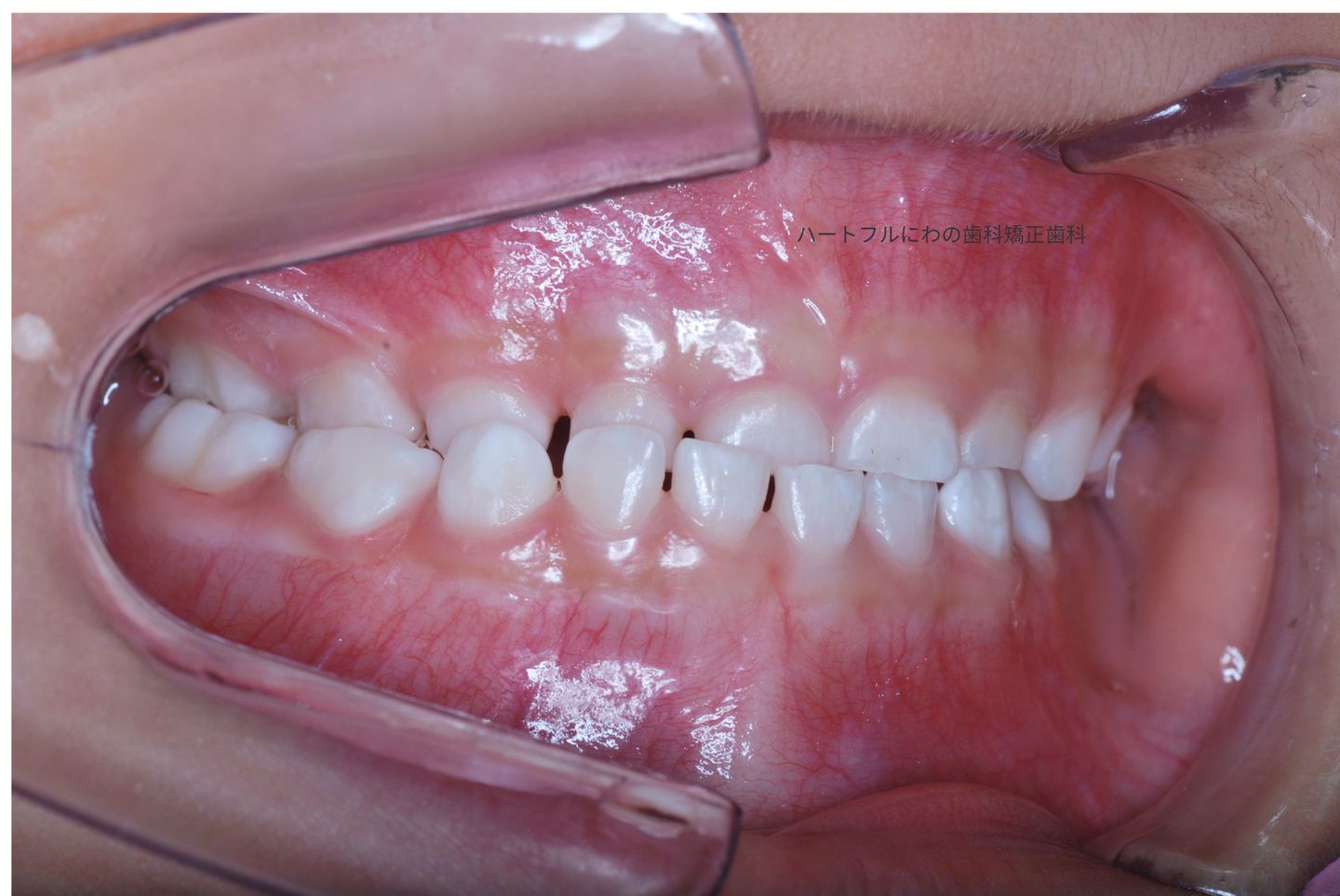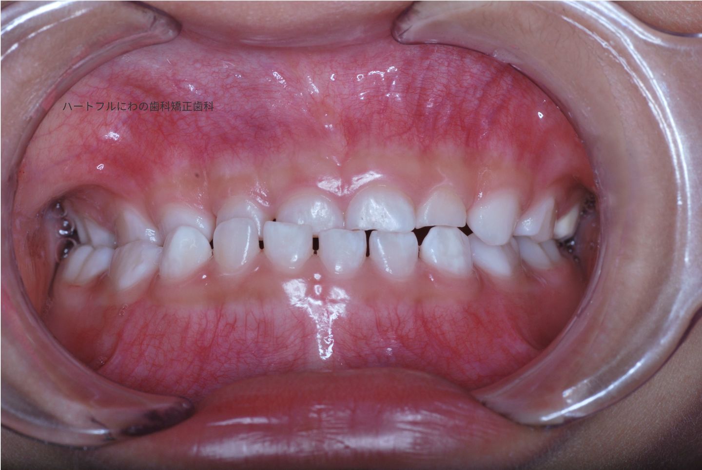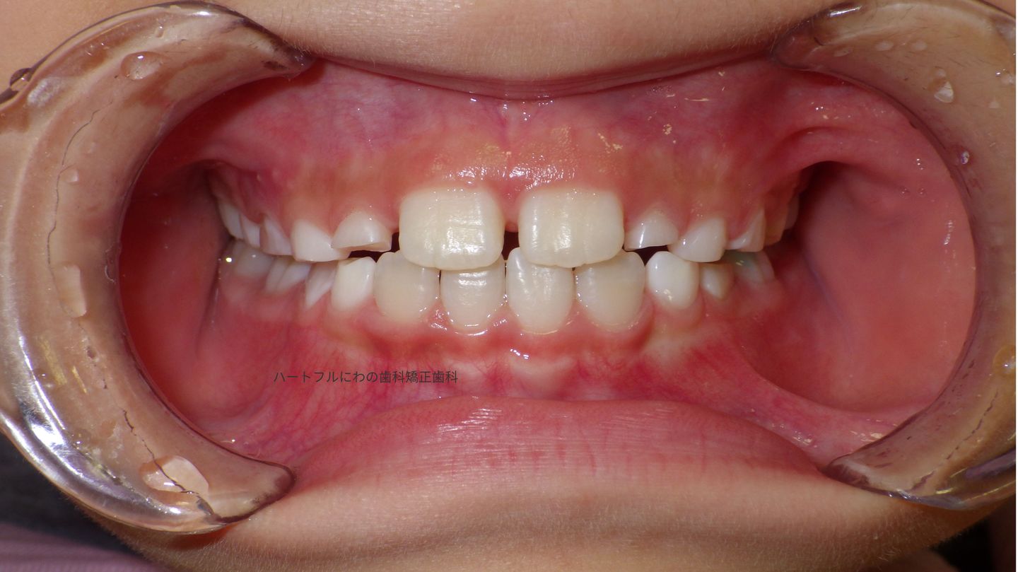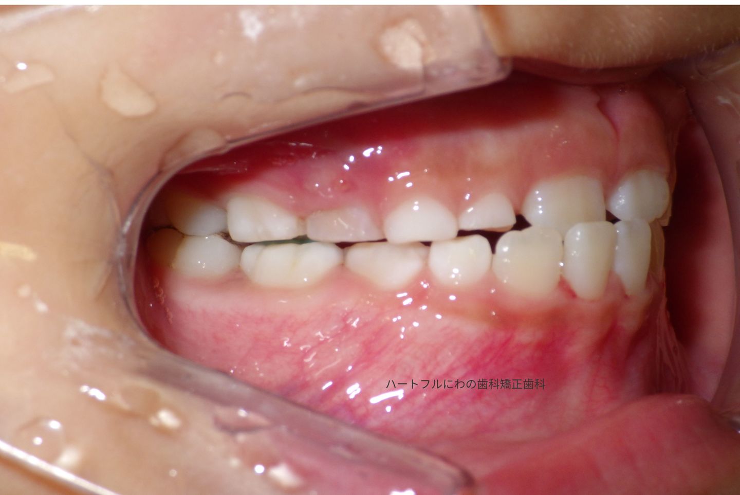 さらに前後的な問題を治しました。このフェーズでは下顎を下げるのではなく、劣成長になっている上顎を成長させることに注力しています。大きくずれていた真ん中もあっています。永久歯萌出まで機能的矯正装置を継続中ですが、反対咬合の再発はありません。