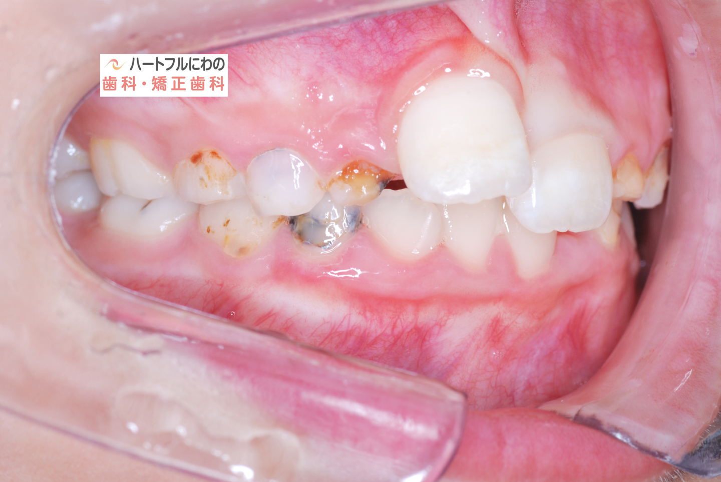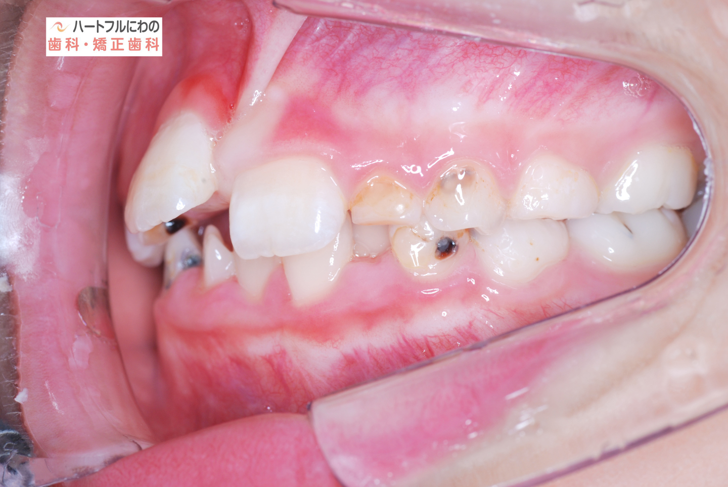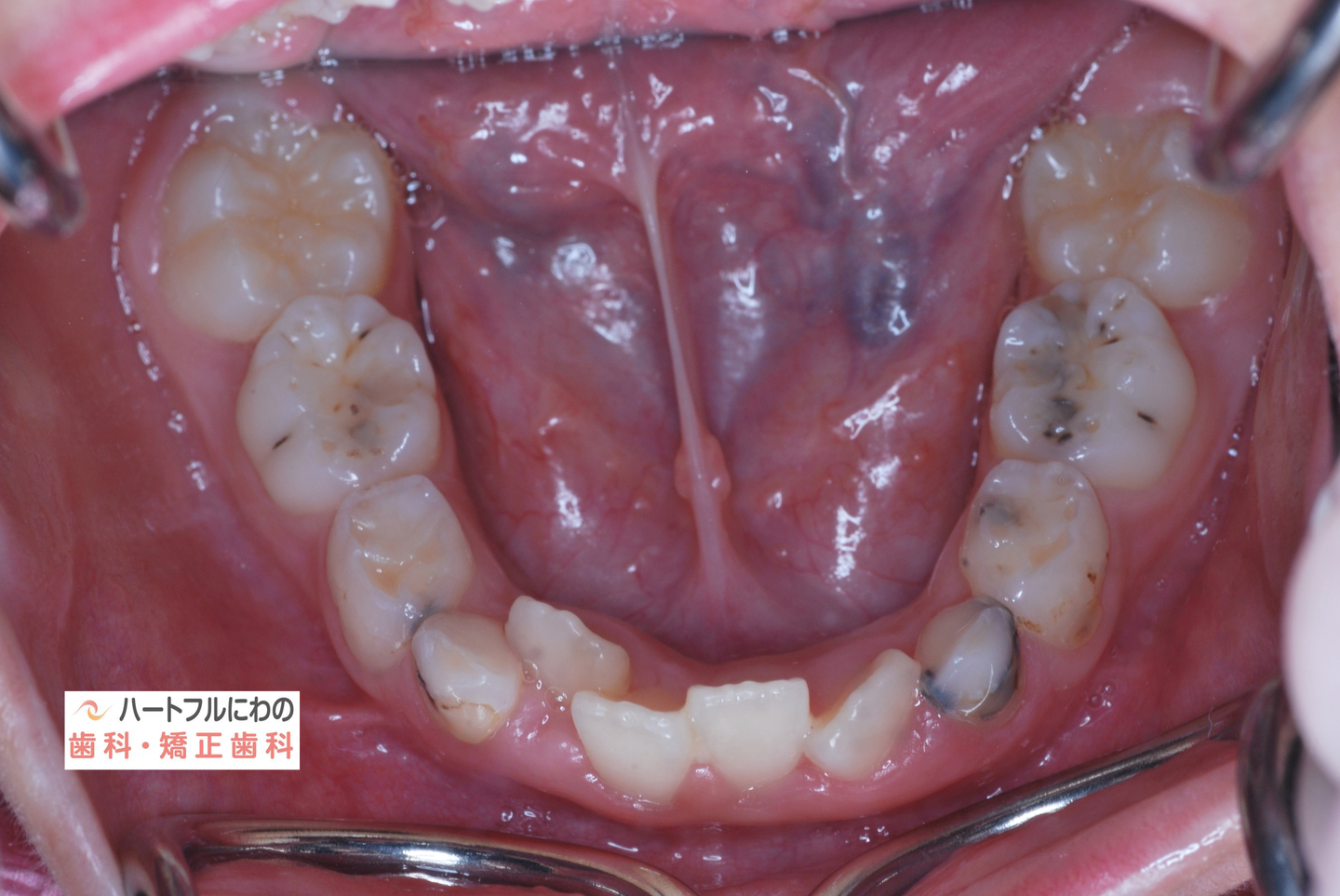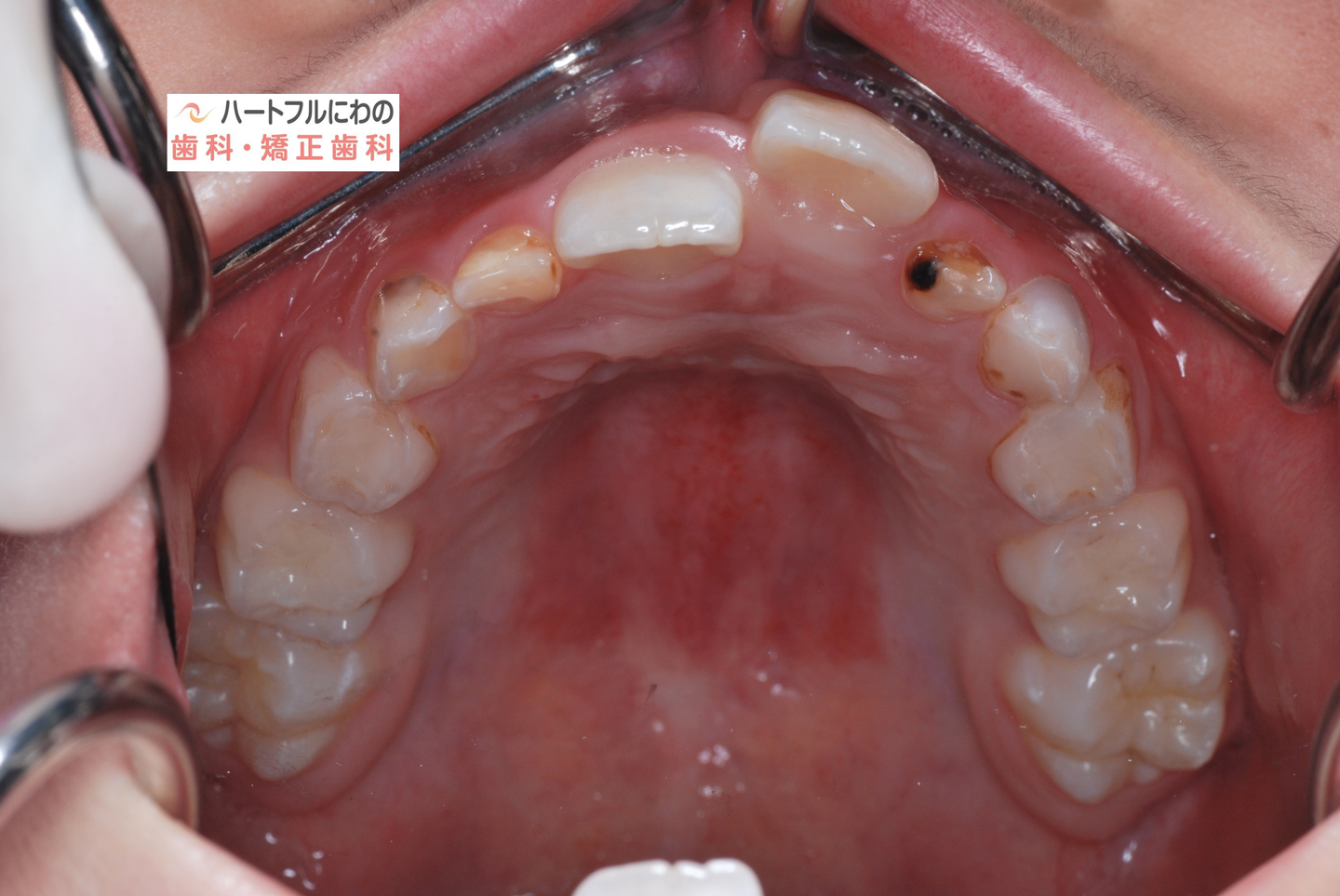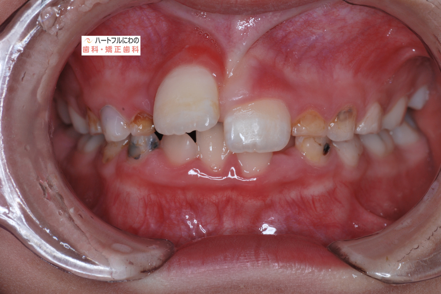 お口の中を拝見すると、上下の叢生(いわゆるガタガタ、乱ぐい)がみられ、多数の虫歯と歯肉炎がみられました。上唇小帯(上唇のすじ)の問題もありました。口呼吸で口腔内が乾燥すると通常の何倍も歯垢が付きやすくなり、虫歯や歯肉炎が頻発します。口呼吸の強い子は重なっている部分のかみ合わせが深い(下の歯がほとんどみえない)のもよく見られる特徴です。