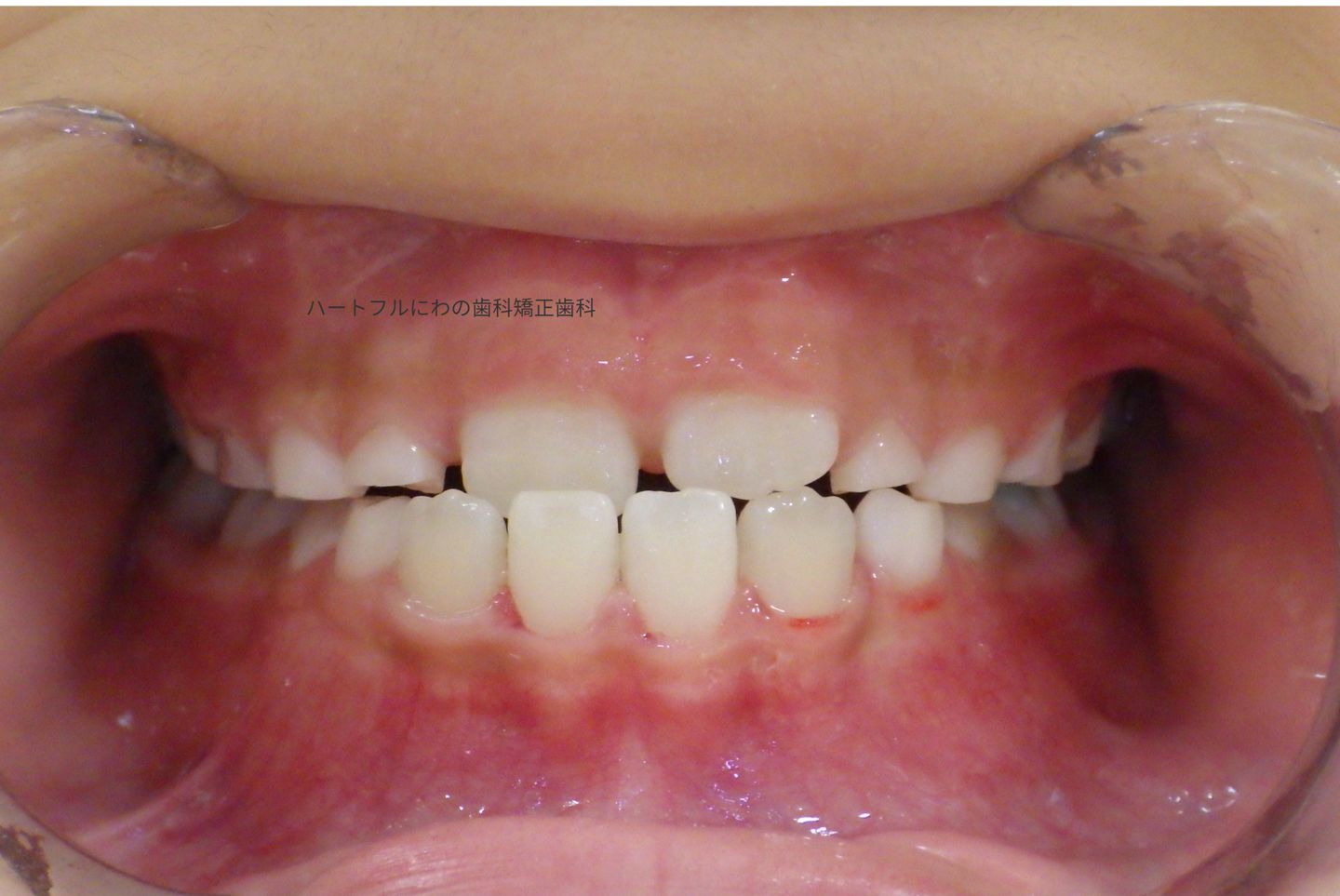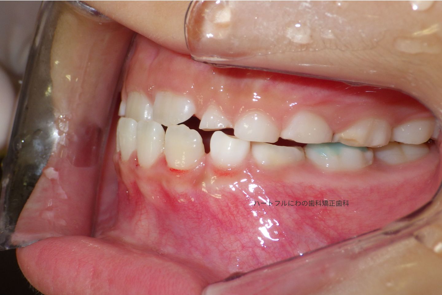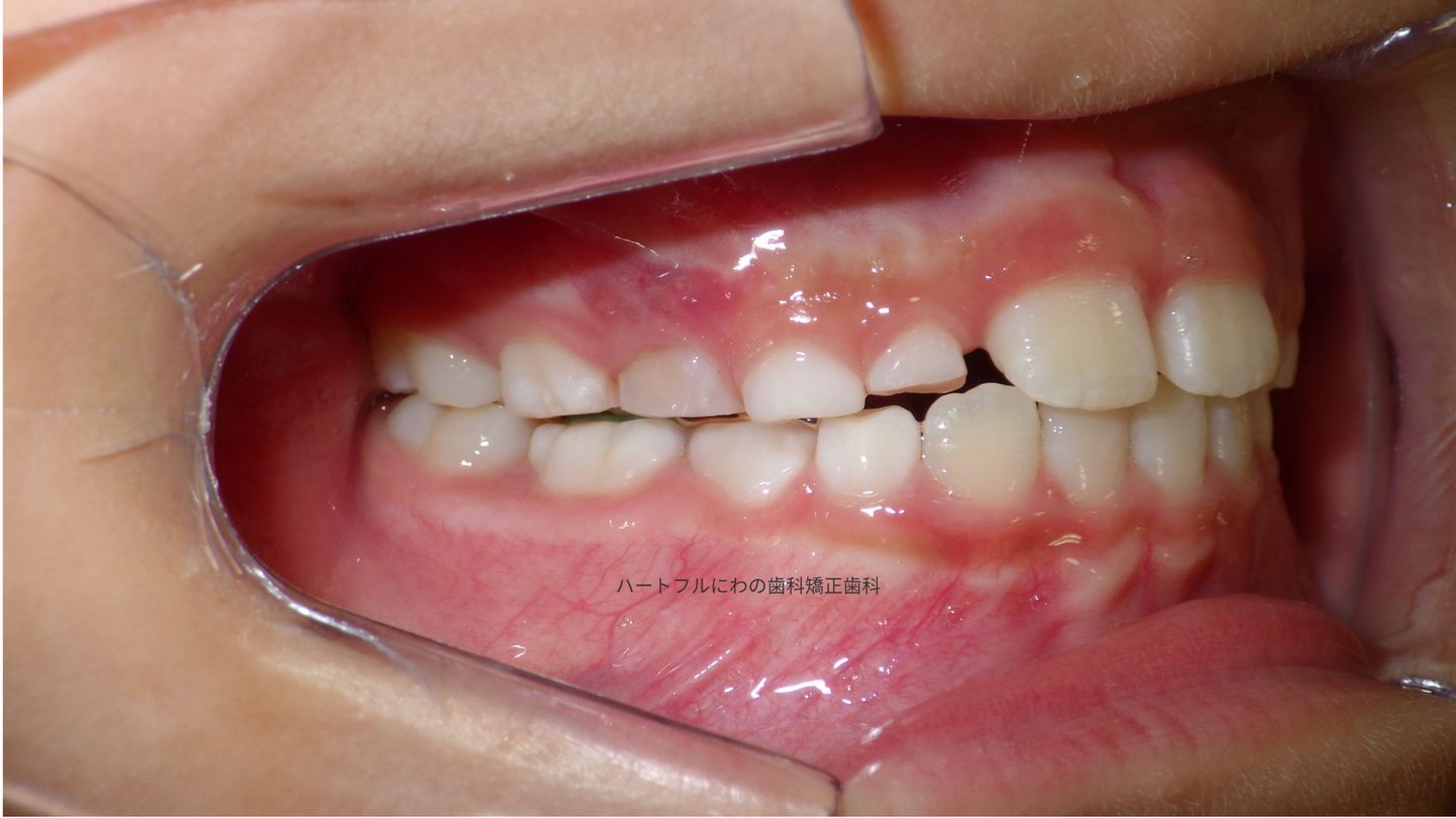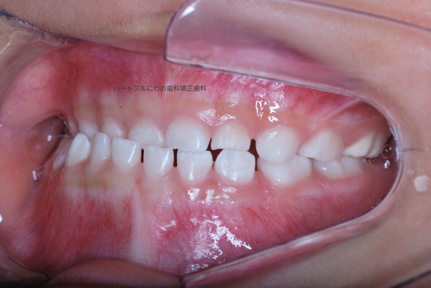 さらに前後的な問題を治しました。このフェーズでは下顎を下げるのではなく、劣成長になっている上顎を成長させることに注力しています。大きくずれていた真ん中もあっています。永久歯萌出まで機能的矯正装置を継続中ですが、反対咬合の再発はありません。
